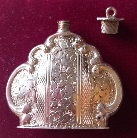 Stříbrný flakón je zdobený rostlinnými motivy. Je puncován platným českým puncem z období Protektorátu Čechy a Morava z roku 1941 a to trojúhelníkem s číslem 3, což je označení stříbra 9001000. Flakón váží celkem 23,47 gramů a platný punc se nachází na hraně podstavce. Flakón měří na výšku včetně stříbrného uzávěru s očkem k zavěšení na řetízek 5,3 cm. Rozměr flakónu v nejširší části je 5 cm a je úzký 1 cm..