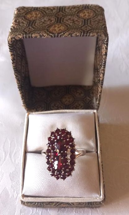 Prsten s českými granáty je puncovaný platným českým puncem pro stříbro 900/1000 a váží 3,90 gramů. Velikost prstenu je 56. Prsten má krásnou oválnou korunu o průměru 2 cm na dílku a 1 cm na šířku. Koruna je osázená českými granáty ve dvou úrovních. v centru koruny jsou dva větší granáty o průměru 4 mm, kolem je 35 drobných granátů o průměru 2 mm. Žádný český granát nechybí, prsten je v pěkném stavu, málo nošený.