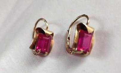 Zlaté náušnice s červenými rubíny jsou puncované platným českým puncem pro zlato 585/1000. Váží celkem 3,00 gramy a měří na výšku 1,5 cm. Jsou v originální původní krabičce.