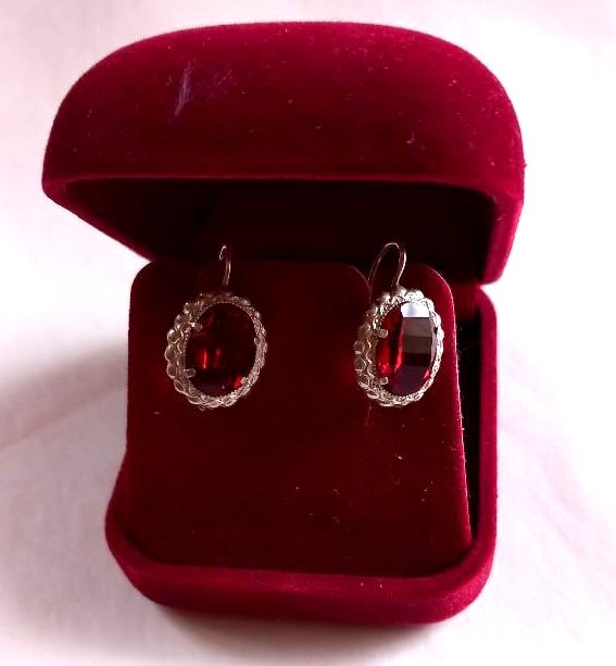 Stříbrné náušnice s velkými červenými rubíny jsou puncované platným českým puncem pro stříbro 800/1000. Váží 4,20 gramů. Celá náušnice měří na výšku 2 cm, průměr červeného kamene na výšku je 1 cm.