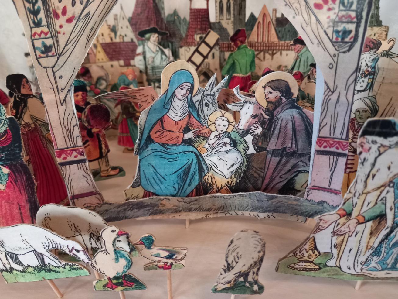 Papírový Betlém má vzadu siluetu města Betléma a vpředu stylizovaný chlév. V Betlému je Madona s Ježíškem a Josef, nad nimi anděl, před nimi 3 králové a kolem 30 postav a 6 zvířat. Lidé jsou většinou oblečeni v krojích.